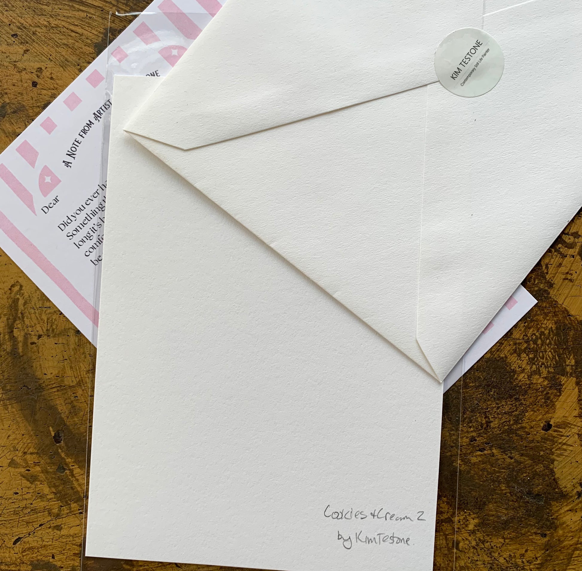 - a small fine art print of one of my ice cream paintings (usually 7" x 5", 6" x 4" or 5" x 5"), signed KimT on the front, and titled and signed Kim Testone on the back, encased in a protective plastic sleeve